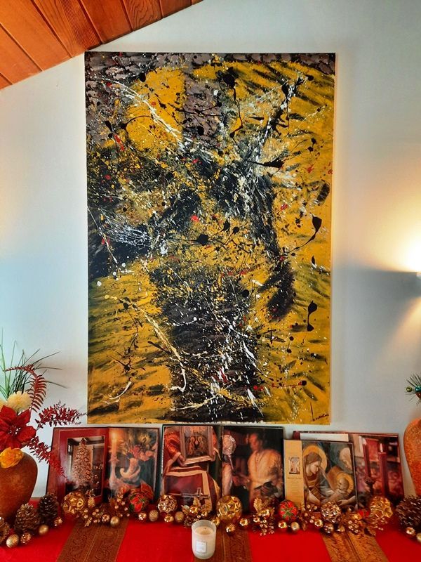 By the way, Ingrid doesn't just paint shirts like the one shown in the photo above. In addition to having been the office manager, bookkeeper and researcher for our writing business (which was writing and editing books, articles and newsletters for Microsoft and other companies in the IT field, but now we are retired) Ingrid is also an accomplished artist who paints with acrylics mostly in abstract expressionist style. Below is a photo of one of my favorite paintings by her along with some of the Christmas decor she has arranged for our holiday season celebrations: